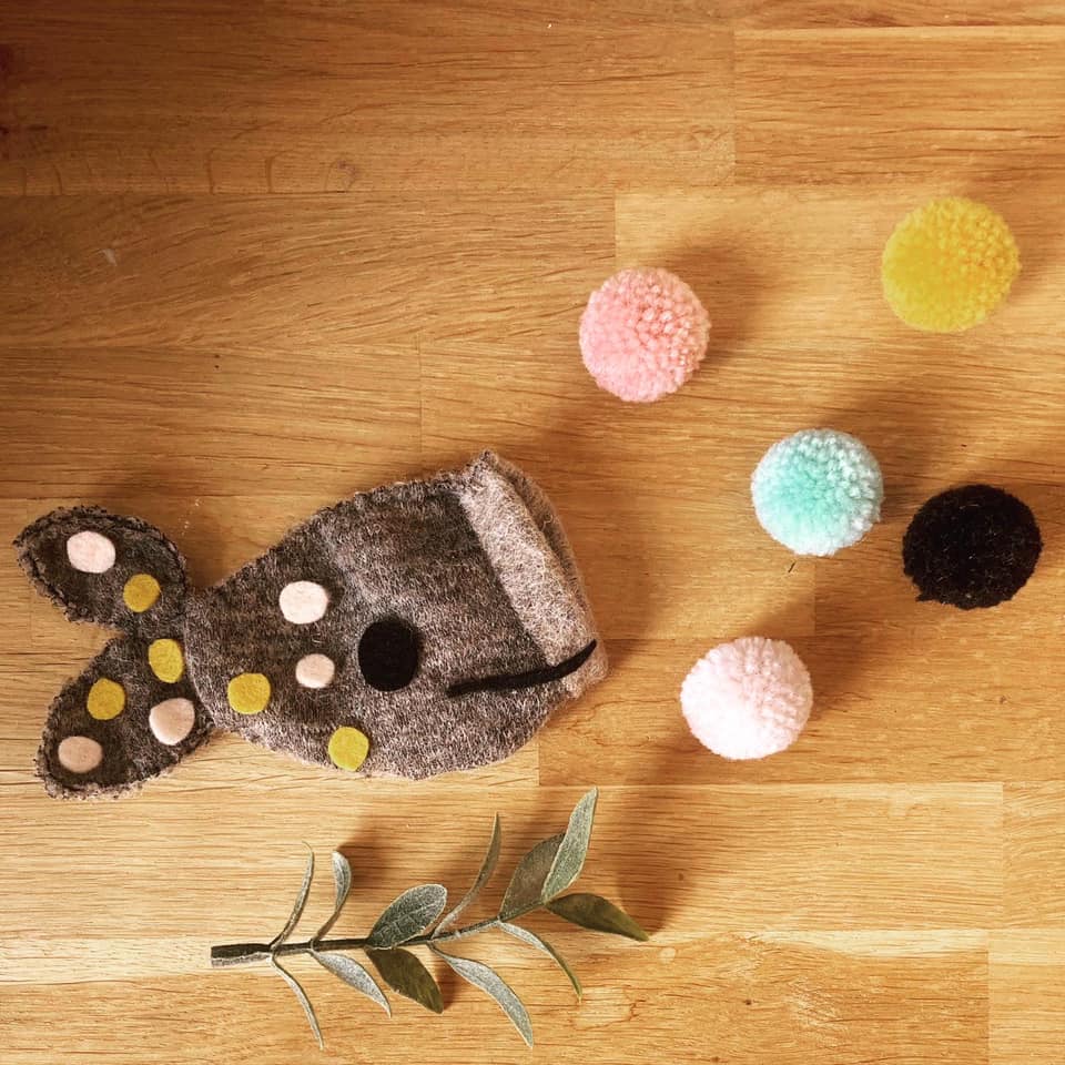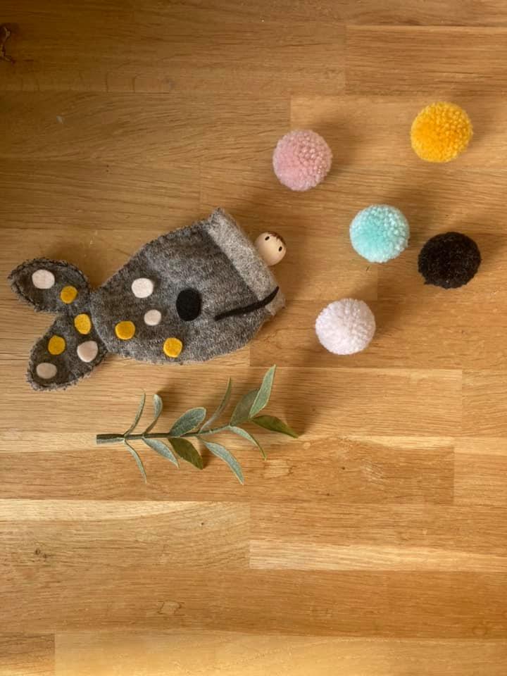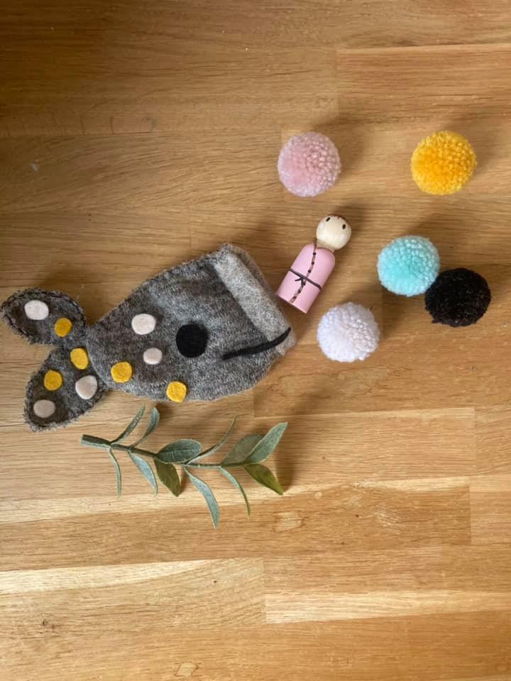 Jona in de walvis, bestaat uit een kleine Jona pop en een, van stof gemaakt, walvis-zakje.