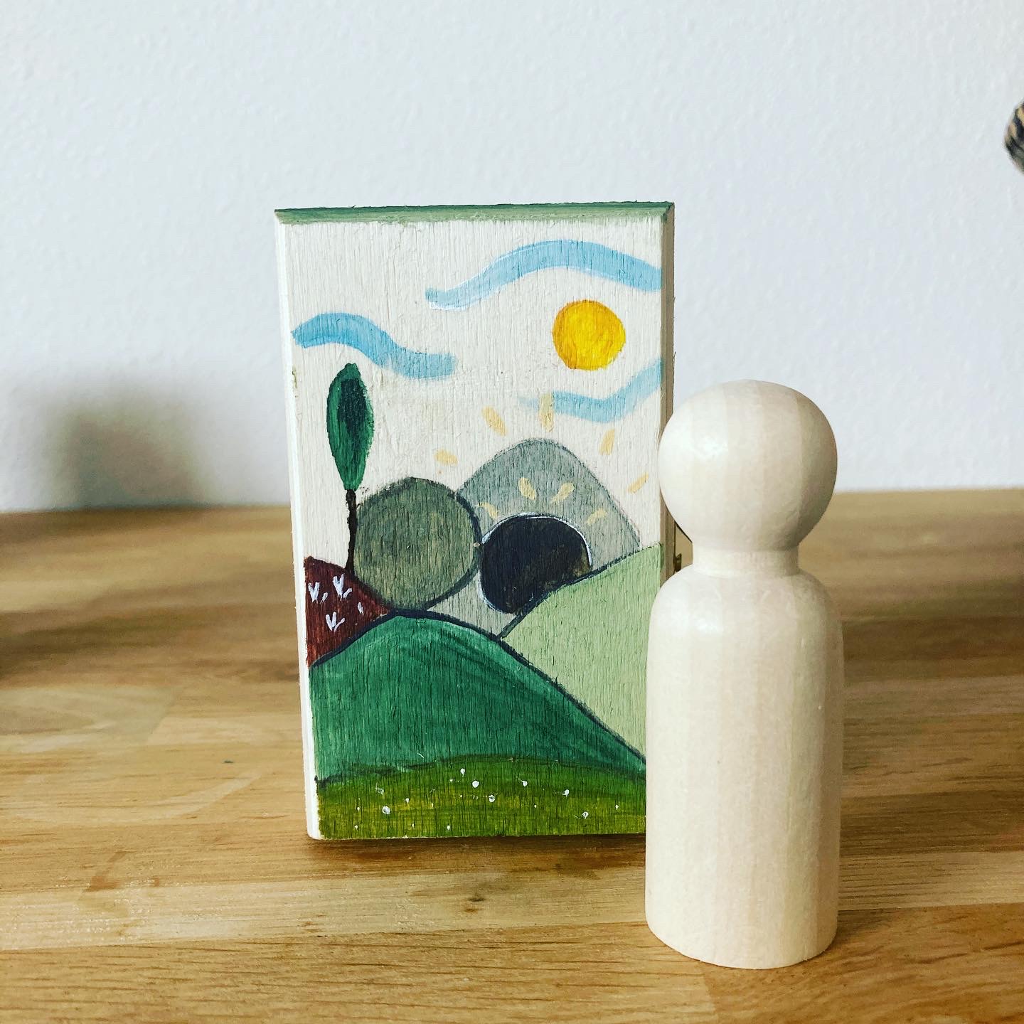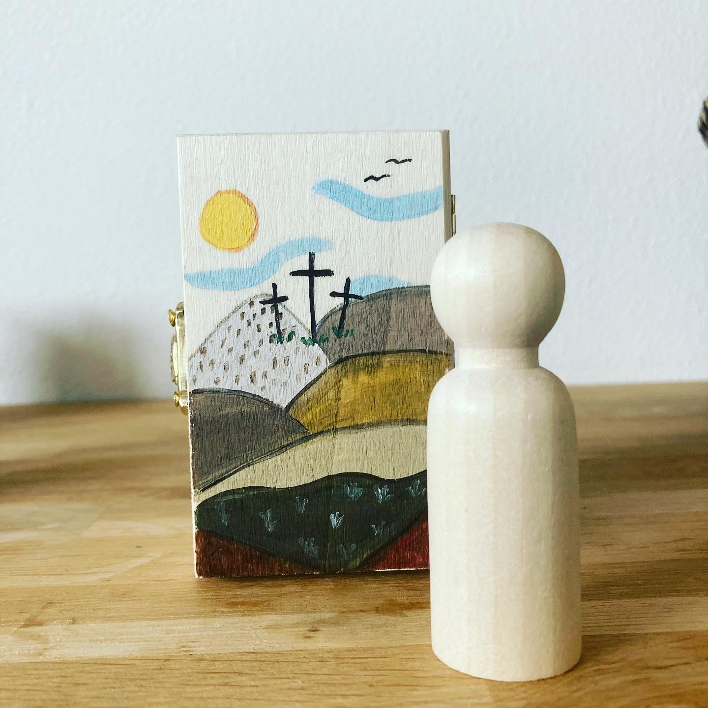 Vertel het paasverhaal met behulp van dit houten doosje. Bij elk deel van het verhaal kantel je het doosje, waardoor weer een nieuw stuk van het verhaal zichtbaar wordt.